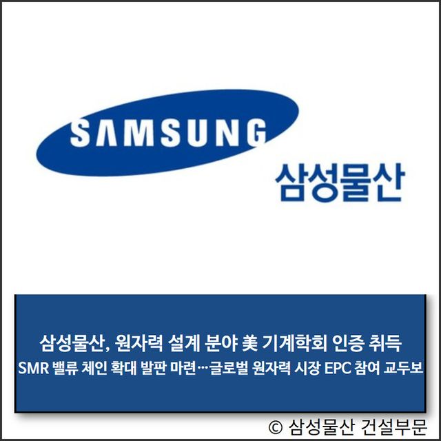 삼성물산(028260) 건설부문(이하 삼성물산)이 미국기계학회로부터 원자력 설계 분야 인증서를 취득하고 SMR(소형 모듈 원자로; Small Modular Reactor) 밸류 체인 확대의 발판을 마련했다.