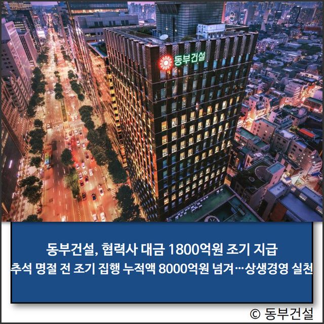동부건설은 지난 설 명절에도 약 800억원을 조기 지급한 데 이어, 이번 추석까지 합산해 2025년 한 해에만 총 2600억원 규모의 거래대금을 명절 전에 앞당겨 지급했다. 이를 포함해 지난 2018년부터 현재까지 누적 조기 지급액은 약 8000억원에 달한다.
