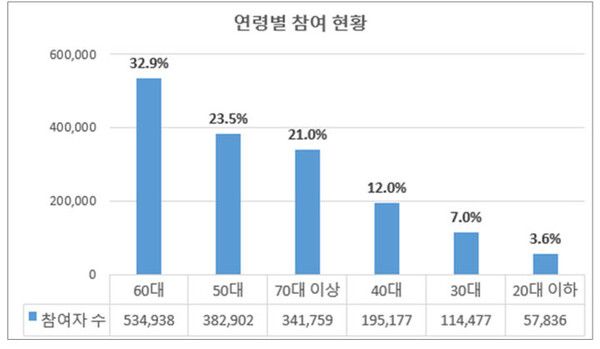 연령대별로는 60대가 53만4938명(32.9%)으로 가장 많았고 50대 38만2902명(23.5%), 70대 이상 34만1759명(21.0%), 40대 19만5177명(12.0%), 30대 11만4477명(7.0%), 20대 이하 5만7836명(3.6%) 순이었다.