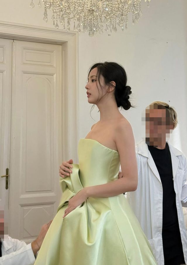 사진 속 그는 페일 그린 컬러의 드레스를 입고 가녀린 어깨라인을 드러내며 우아한 자태를 뽐냈다. 하늘색 구두로 포인트를 더해 사랑스러운 매력을 극대화했다. 마치 디즈니 만화 속 주인공이 현실에 등장한 듯 비현실적인 비주얼로 감탄을 자아냈다.