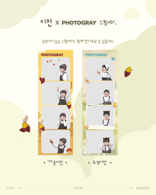 라인업으로는 유이진의 따뜻하고 귀여운 매력을 고스란히 담은 ‘요정이진’과 ‘가을이진’으로, 총 2종의 포토 프레임이 마련됐다. ‘요정이진’은 동화 속 주인공 같은 맑은 분위기와 사랑스러운 표정이, ‘가을이진’은 따스한 계절감과 함께 차분한 감성을 담아냈다.