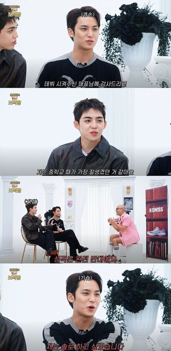 민규가 "(에스쿱스) 어렸을 때 잘생겼었다"고 하자 에스쿱스는 "지금은 별로란 거냐"고 덧붙였다.