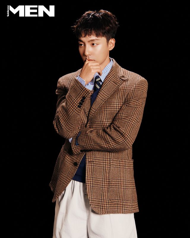 체크 패턴 재킷과 스트라이프 셔츠, 니트 베스트 모두 Polo Ralph Lauren, 화이트 스트라이프 팬츠 Recto, 타이 Brooks Brothers.