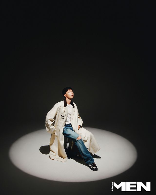 베이지 롱 코트 Kenzo, 화이트 이너 톱 Heute, 데님 팬츠 Stitch Comes Blue by Beaker, 슈즈 Sacai.