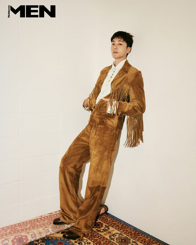 브라운 스웨이드 재킷과 팬츠, 데님 셔츠 모두 Golden Goose, 브라운 슈즈 Versace.