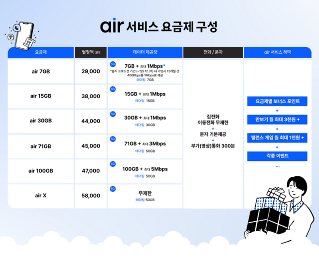 에어의 요금제는 △월 2만7000원·7GB(소진시 400Kbps) △3만8000원·15GB(1Mbps) △4만4000원·30GB(1Mbps) △4만5000원·71GB(3Mbps) △4만7000원·100GB(5Mbps) △5만8000원·무제한(테더링 50GB) 등 5G 핵심 데이터 구간 6개로 구성된다.