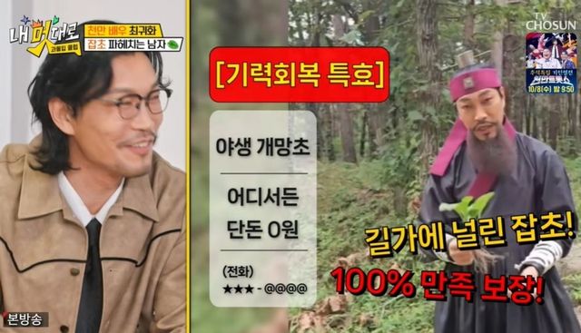 이어 최귀화는 잡초 갯질경차를 끓였다. 최귀화는 “제가 섬에 농장이 있다. 농약을 사용하지 않고, 사람도 오가지도 않는다. 깨끗한 땅에서 자라는 잡초를 재배하고 수확하기 위해서 땅을 매입했다”라고 밝혔다. 고양시 집에서 잡초 농장까지 360km가 걸린다고.
