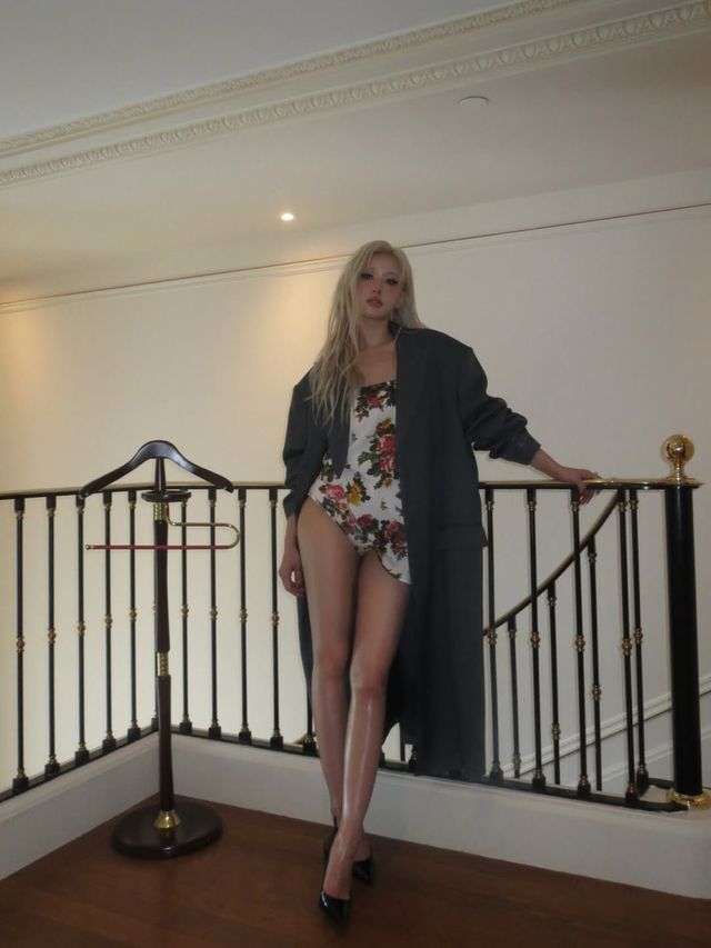 사진 속 전소미는 플로럴 패턴의 튜브톱 스타일의 원피스를 입고, 오버사이즈 재킷과 하이힐을 매치한 채 고급스러운 분위기의 실내와 발코니에서 포즈를 취하고 있다.