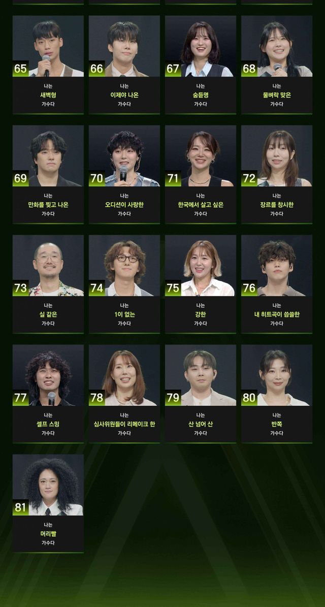 ‘나는 아직도 꿈꾸는 가수다’, ‘나는 이방인 가수다’, ‘나는 KPOP이 무서웠던 가수다’, ‘나는 환승하고 싶은 가수다’, ‘나는 산 넘어 산 가수다’, ‘나는 화해가 필요한 가수다’ 등의 사연도 범상치 않다. 음악에 대한 진심 하나로 도전에 나선 81인의 무명가수가 또 어떤 무대를 보여줄지 주목된다.