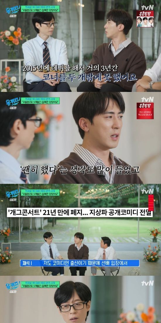 당시 1400명의 지원자 중 합격자 8명 중 한 명이었다는 김원훈은 "저는 '개콘'에 나가면 하루아침에 스타가 될 줄 알았다. 그런데 데뷔 후 3년동안 코너를 2개밖에 못했다"고 회상했다.