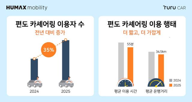 2일 종합 모빌리티 기업 휴맥스모빌리티에 따르면 카셰어링 브랜드 ‘투루카’의 편도형 카셰어링 서비스 ‘리턴프리’의 올해 1~8월 이용률이 전년 동기 대비 35% 급증한 것으로 나타났다. 평균 운행거리는 34.5㎞, 평균 이용시간은 55분으로 공항 접근을 위한 중거리 이동과 도심 내 단거리 이동이 많았다.