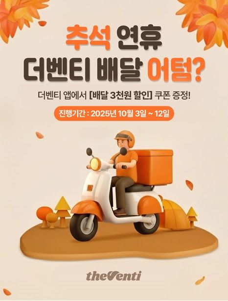커피 프랜차이즈 더벤티가 추석 연휴를 맞아 ‘더벤티 멤버십 앱’ 배달 주문 시 사용할 수 있는 3000원 할인 쿠폰을 제공한다.
