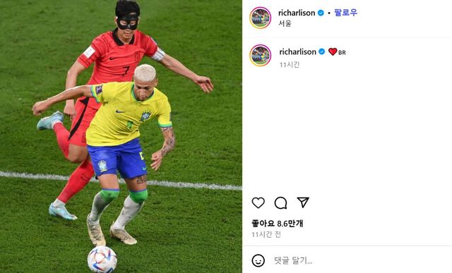그는 지난 한국과의 친선전 당시 브라질 유니폼을 입고 손흥민과 맞붙었던 사진을 다시 올리며 브라질 국기와 하트 이모티콘을 덧붙였다.