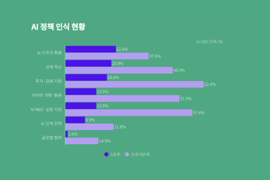 AI 스타트업 101개사를 대상으로 조사한 결과, 스타트업들이 가장 기대하는 정책은 AI 인프라 확충, 규제 혁신, 투자·금융 지원, 데이터 개방·활용 순으로 나타났다.