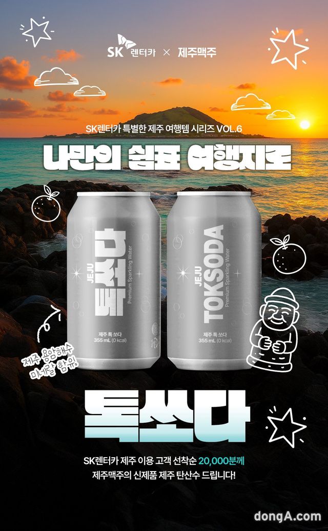 이번 행사는 ‘제주도, 나만의 쉼표 여행지로 톡쏘다’라는 콘셉트로 진행됐다. SK렌터카 제주 이용 고객에게는 차량 1대당 ‘제주톡쏘다’ 탄산수 2캔이 제공된다. 또 제주 여행 중 제품과 함께한 사진을 SNS에 올리면 추첨을 통해 워커힐 상품권과 제주맥주 굿즈패키지, 스타벅스 기프티콘이 제공된다.