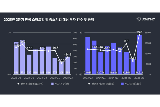 더브이씨(The VC)가 2025년 3분기 국내 스타트업 투자 통계를 공개했다. 3분기 투자 건수는 296건으로 전년 동기 대비 35% 감소했으나, 투자 금액은 2조4,326억원으로 직전분기 대비 152%, 전년 동기 대비 24% 증가했다.