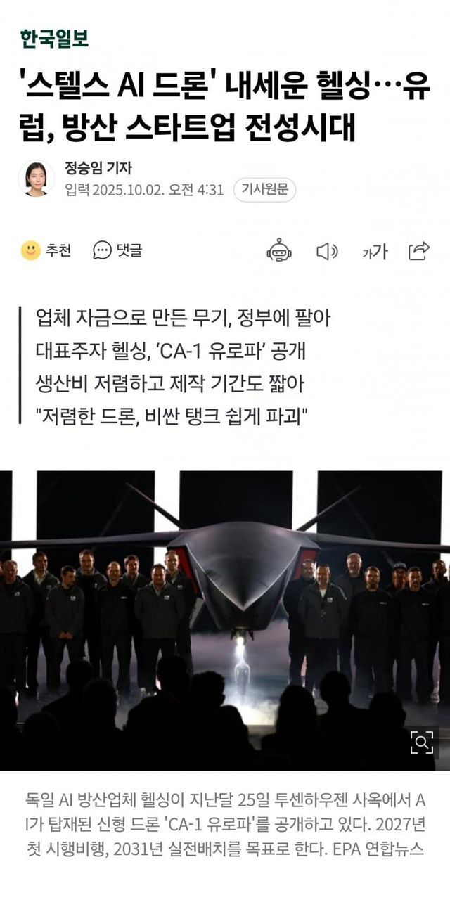 독일 신흥 방산기술기업 헬싱이 AI와 스텔스를 드론한 대형 드론을 이번에 공개한것이다.