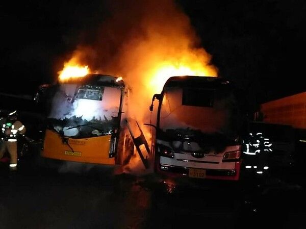"주차 된 버스 뒷부분에 불이 났다"는 신고를 받고 출동한 경기소방은 장비 10여대와 소방관 50여명을 투입해 오후 8시30분께 불을 껐다.