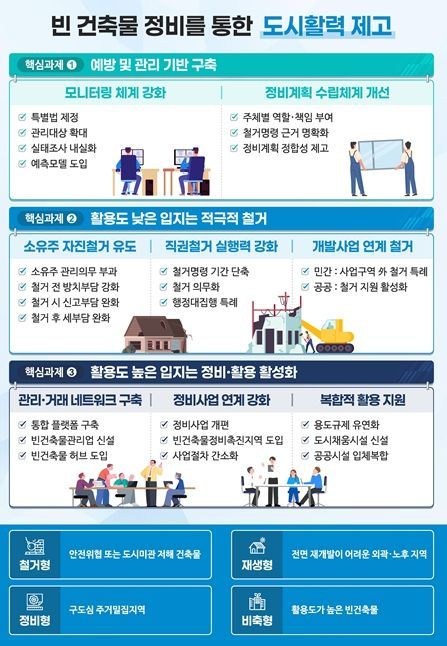 이에, 국토부는 ➊예방 및 관리 기반 구축, ➋활용도 낮은 빈 건축물의 적극적 철거, ➌활용도 높은 빈 건축물의 정비·활용 활성화 등 빈 건축물의 입체적 정비방안을 마련했다.
