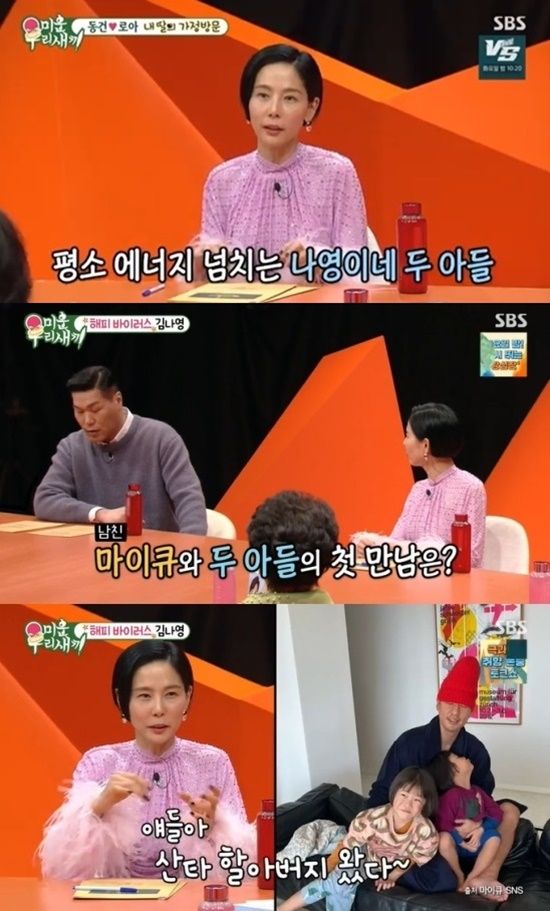 이날 방송에서 김나영은 아들들과 마이큐의 첫 만남을 언급하며 "(마이큐가) 산타할아버지 분장을 하고 와서 선물을 나눠줬다. 아이들이 제 남자친구인 것을 안다. 삼촌이라고 부른다"고 설명했다.