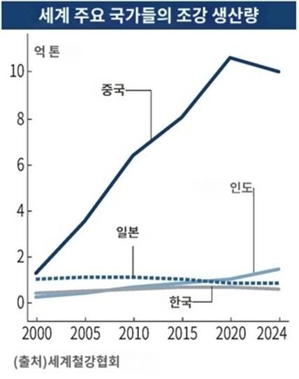 한국무역협회에 따르면 24년 중국 철강 수출 가격은 전년 대비 19% 하락했다. 같은 해 10월 이후 톤당 4000위안(약 8만 원)으로 한국 탄소강보다 20% 정도 저렴한 수준을 유지하고 있다고 한다.