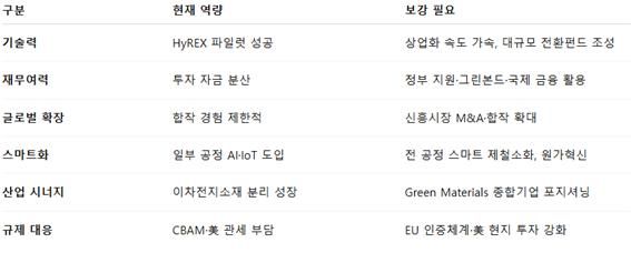 포스코는 수소환원제철 성공으로 친환경 전환의 씨앗은 확보했지만, 자금·시장 확장·스마트화 측면에서 역량이 부족하다는 평가가 많다. 세계 철강 톱티어(최상위)로 복귀를 위해서는 정부와 공동 투자, 글로벌 파트너십, AI 기반 스마트 제철소 전환 등이 병행되어야 한다.