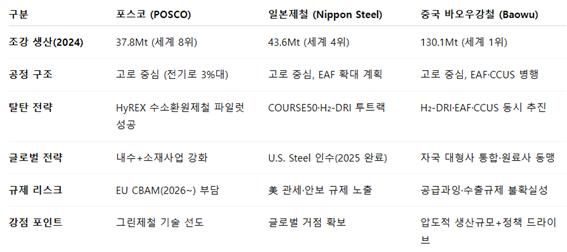 그러나 상업화까지는 갈 길이 멀다. 수십조 원이 필요한 대규모 투자 없이는 꿈에 그칠 수 있다. 일본제철이 COURSE50과 H2-DRI라는 투트랙 전략을 병행하며 단계적 로드맵을 제시하고, 바오우강철이 CCUS와 EAF, 대규모 DRI 프로젝트를 동시에 추진하는 것과 비교하면, 포스코의 행보는 아직 속도와 규모에서 뒤처져 있다.