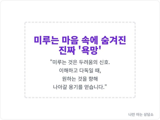 즉, 미루는 습관은 성격의 결함이 아니라, 우리 마음이 보내는 불안과 두려움의 신호입니다.