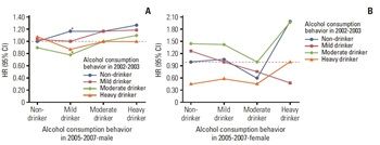 (그래프 : 남성과 여성의 음주량 변화에 따른 위암 상대위험도 변화)