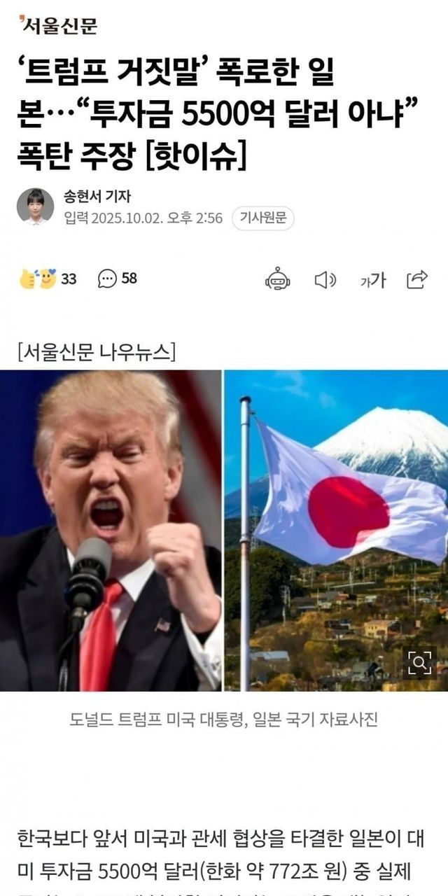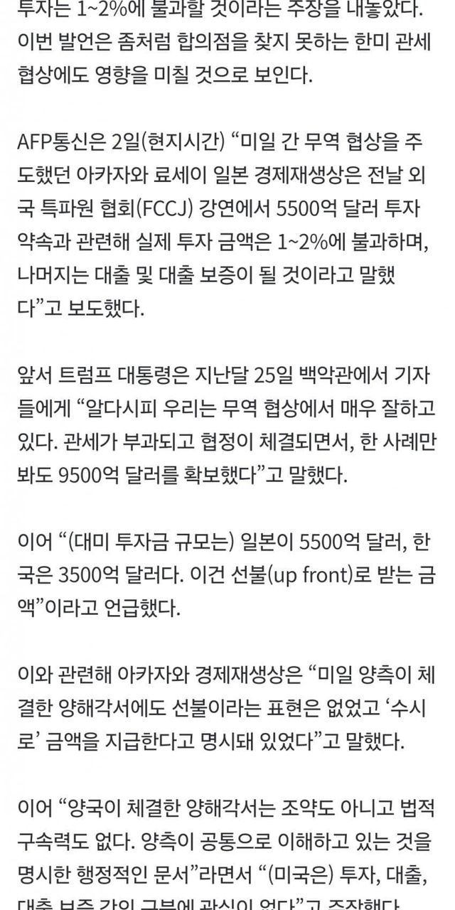 일본과 한국투자는 모두 현금이고 선불이라는 트럼프의 발언에 정면으로 맞서는 것 ㄷㄷ