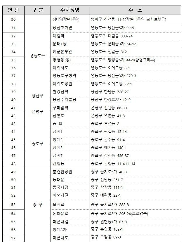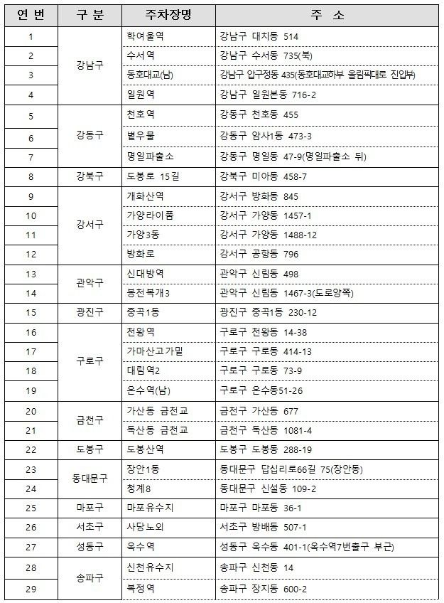 아래는 서울시설공단에서 공지한 무료 개방 공영주차장 목록이다.