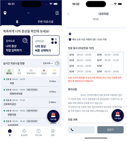 이 앱은 사용자가 직접 입력한 증상 정보를 바탕으로 중증환자는 응급실 방문을, 경증환자는 가까운 병의원 우선 방문과 자가 응급처치방법을 안내한다.