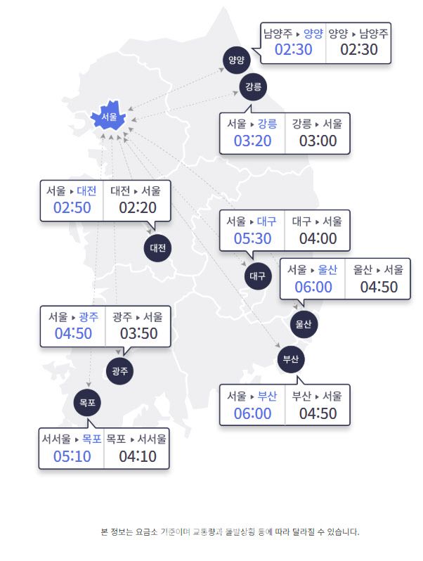 지방에서 서울까지는 △부산 4시간 50분 △울산 4시간 50분 △강릉 3시간 △양양 2시간 30분(남양주 도착) △대전 2시간 20분 △광주 3시간 50분 △목포 4시간 10분(서서울 도착) △대구 4시간이 걸릴 것으로 예상된다.
