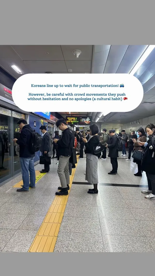 한국에선 대중교통 기다리는 중에 대기선 라인에 줄 서있음