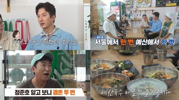 이후 정준호의 단골 식당이자, '예산 8미(味)'인 예산국수를 먹으러 갔다. 이곳에서 멸치국수, 콩국수 등을 푸짐하게 주문한 이들은 식당 한 켠에 걸린 정준호와 아내 이하정의 사진을 보고는 "형님 결혼식이 궁금하다"고 '결혼 토크'를 시작했다.