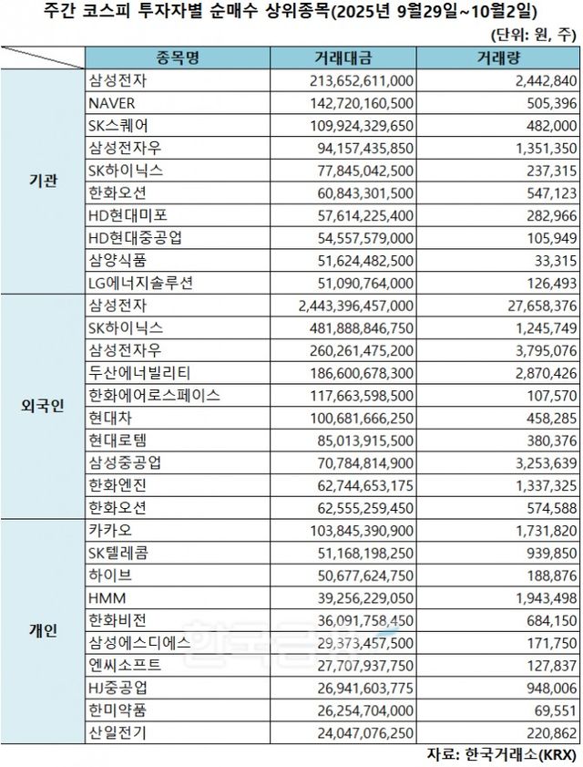 기관 '삼성전자'·외인 '삼성전자'·개인 '카카오' 1위 [주간 코스피 순매수- 2025년 9월29일~10월2일]