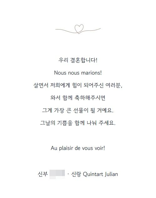 두 사람은 청첩장을 통해 "우리 결혼합니다! 살면서 저희에게 힘이 되어주신 여러분, 와서 함께 축하해주시면 그게 가장 큰 선물이 될 거예요. 그날의 기쁨을 함께 나눠주세요"라는 메시지를 전했다.
