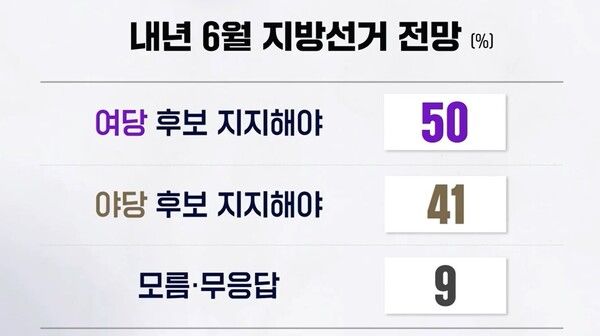 SBS가 입소스에 의뢰해 지난 1일부터 2일까지 전국 만 18세 이상 성인 1000명을 대상으로 실시한 조사에서 내년 지방선거에서 어떤 정당을 지지할 것인지 묻자 '현 정부에 힘을 실어주기 위해 여당 후보를 지지해야 한다'는 응답이 50%, '현 정부를 견제하기 위해 야당 후보를 지지해야 한다'는 41%로 집계됐다.