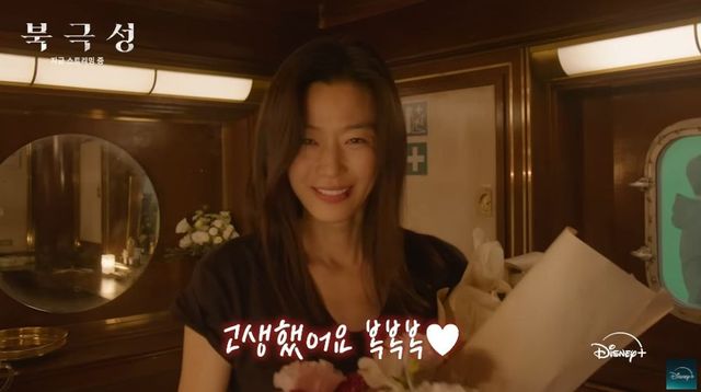 이날 공개된 영상엔 ‘북극성’ 마지막 촬영에 나선 강동원과 전지현의 모습이 담겼다. 박수 속에 마지막 촬영을 마친 이들은 꽃과 케이크를 선물로 받고는 “감사하다. 고생하셨다”라며 스태프들에게 공을 돌렸다.