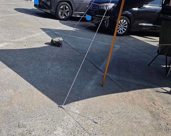 공개된 사진에는 지난달 29일 한 캠핑객이 거제시 해수욕장 방파제 인근 공영주차장 바닥에 여러 개의 구멍을 내고, 어닝과 로프를 고정한 모습이 담겼다. 로프는 인도와 차도 방향으로 뻗어 있었다.