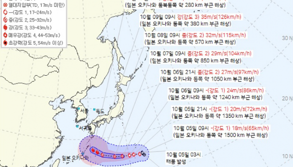 일본기상청(JMA)은 태풍이 일찍 전향해 오는 10일쯤 규슈 남쪽 해상까지 진출할 것으로 내다봤다.