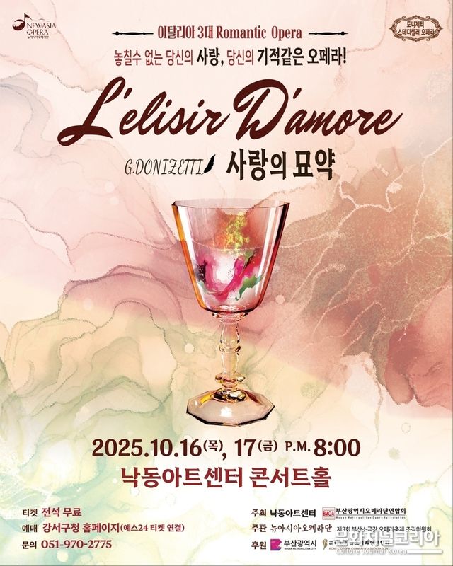 예술총감독을 맡은 그레이스 조 뉴아시아오페라단 단장은 "도니제티의 오페라 '사랑의 묘약'은 인간의 순수한 마음과 사랑의 진심을 노래하는 작품으로, 오늘날에도 여전히 큰 울림을 준다"며 "이번 공연을 통해 관객들이 웃음과 감동 속에서 '사랑의 본질'을 다시 한 번 느끼길 바란다"고 전했다.