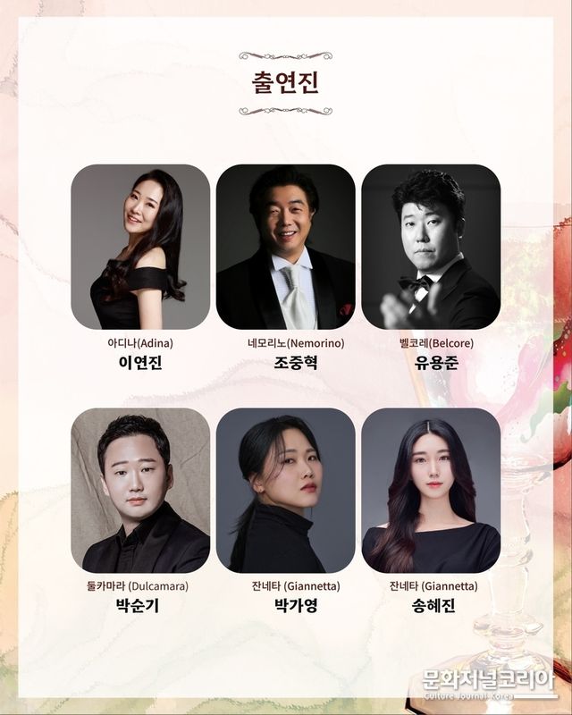 순박하지만 진실한 사랑을 품은 네모리노 역은 부드러운 음색과 감성적 해석으로 호평받는 테너 조중혁이 맡았으며, 당당한 아디나 역에는 폭넓은 표현력의 소프라노 이연진이 출연한다.