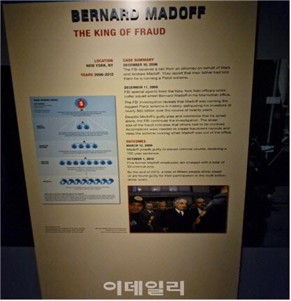여기에만 그치지 않습니다. 미 워싱턴 D.C.에 위치한 연방수사국(FBI) 본부에 가면 버나드 메이도프 사건이 ‘FBI의 역대 주요 사건’ 중 하나로 일반에 공개돼 있습니다. 닉슨 대통령 사퇴의 원인이 된 ‘워터게이트’ 사건과 나란히 전시돼 있지요. 미국이 얼마나 자본주의 신뢰를 깨는 경제 범죄를 엄중하게 바라보고 있는지 실제로 느낄 수 있습니다.