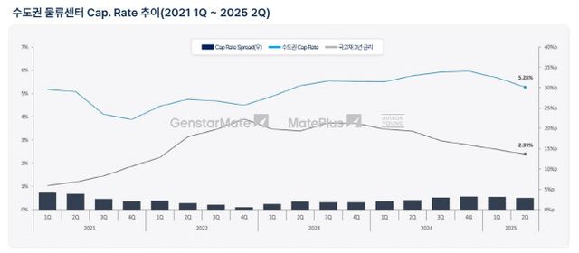 6일 국내 최대 상업용부동산 서비스기업 젠스타메이트에 따르면 올해 2분기 수도권 물류센터 캡레이트는 전분기 대비 0.15%포인트(p) 하락한 5.2%로, 작년 4분기 이후 하락세 전환이 지속됐다.