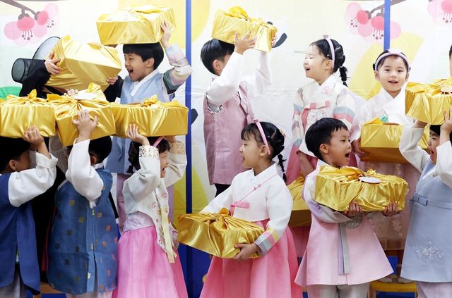 추석 선물을 받고 기뻐하는 어린이집 원생들 / 뉴스1 (광주 북구 제공)