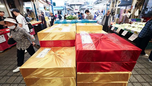 추석 명절을 맞아 선물용 상자가 쌓여있는 전통시장 / 뉴스1