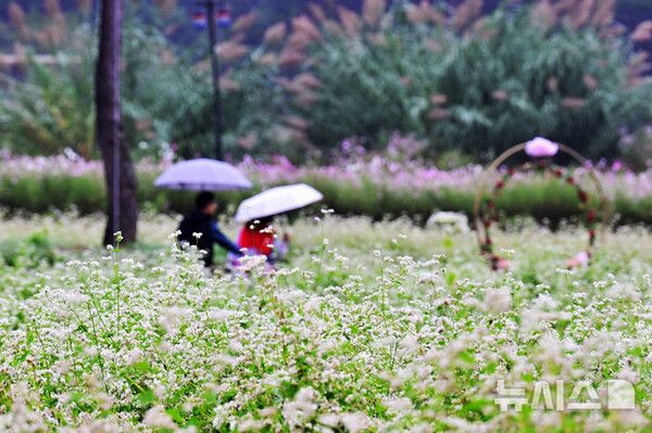 추석 연휴인 6일 오전, 가을비가 촉촉이 내리는 경남 하동군 북천면의 코스모스·메밀꽃 단지에는 흐린 날씨에도 가을의 정취를 즐기려는 탐방객들의 발걸음이 이어졌다.
