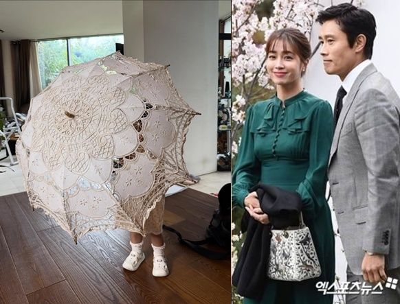 사진 속 이민정 이병헌의 딸 서이 양은 이병헌의 사진이 새겨진 우산을 뚫어지게 바라보고 있어 웃음을 자아낸다.