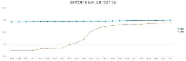 2일 기준, 강릉시 오봉저수지 저수율은 69.0%를 기록했다. 지난달 21일 51.8%로 저수율이 절반을 넘은 이래 꾸준히 증가했다. 저수율은 17~21일 동안 가장 높은 증가세를 보였다. 5일간 200mm(밀리미터)가 넘는 누적강수량이 강릉 전 지역에 내리면서, 저수율도 16.7%에서 51.8%로, 극적으로 회복됐다. 오봉저수지는 강릉시 생활용수의 약 87%를 공급하는 취수원이다.